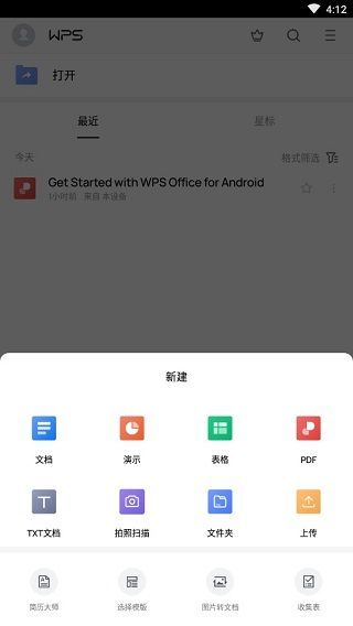 1、安装好软件,进入软件界面,在“最近”的功能栏里,选择“+”号即可弹出办公所需的文件格式。如图:
