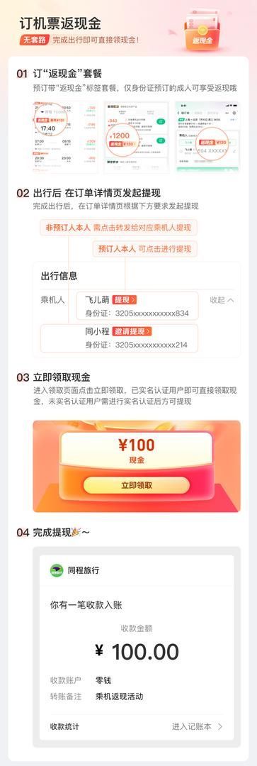 领取返现方法:需要您实名认证后,在同程微信旅行小程序-我的-我的订单-进入具体参与活动的订单--出行信息--乘机人姓名旁边有一个邀请提现--分享给乘机人本人微信号--在微信里面点击链接领取。