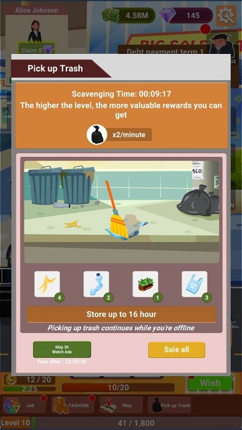 此外,游戏内还有许多工作性质,包括清扫,手工制作等等,待满足以上条件后你便能源源不断的创造财富,早日实现东山再起。