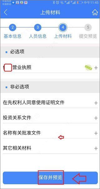 6、在上传资料中填写营业执照信息以及相关文件等,点击保存并预览。