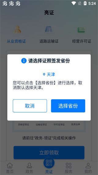 1、打开运政通app,选择证照签发省份;
